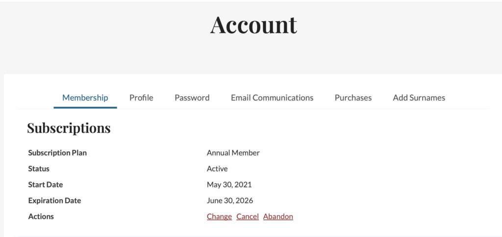 Once you have signed up for a joint membership, log in to your account and click on Account at the top right of the page (or click this link to go directly to the accounts page). Under the Membership tab, you will see the option to Manage Group.